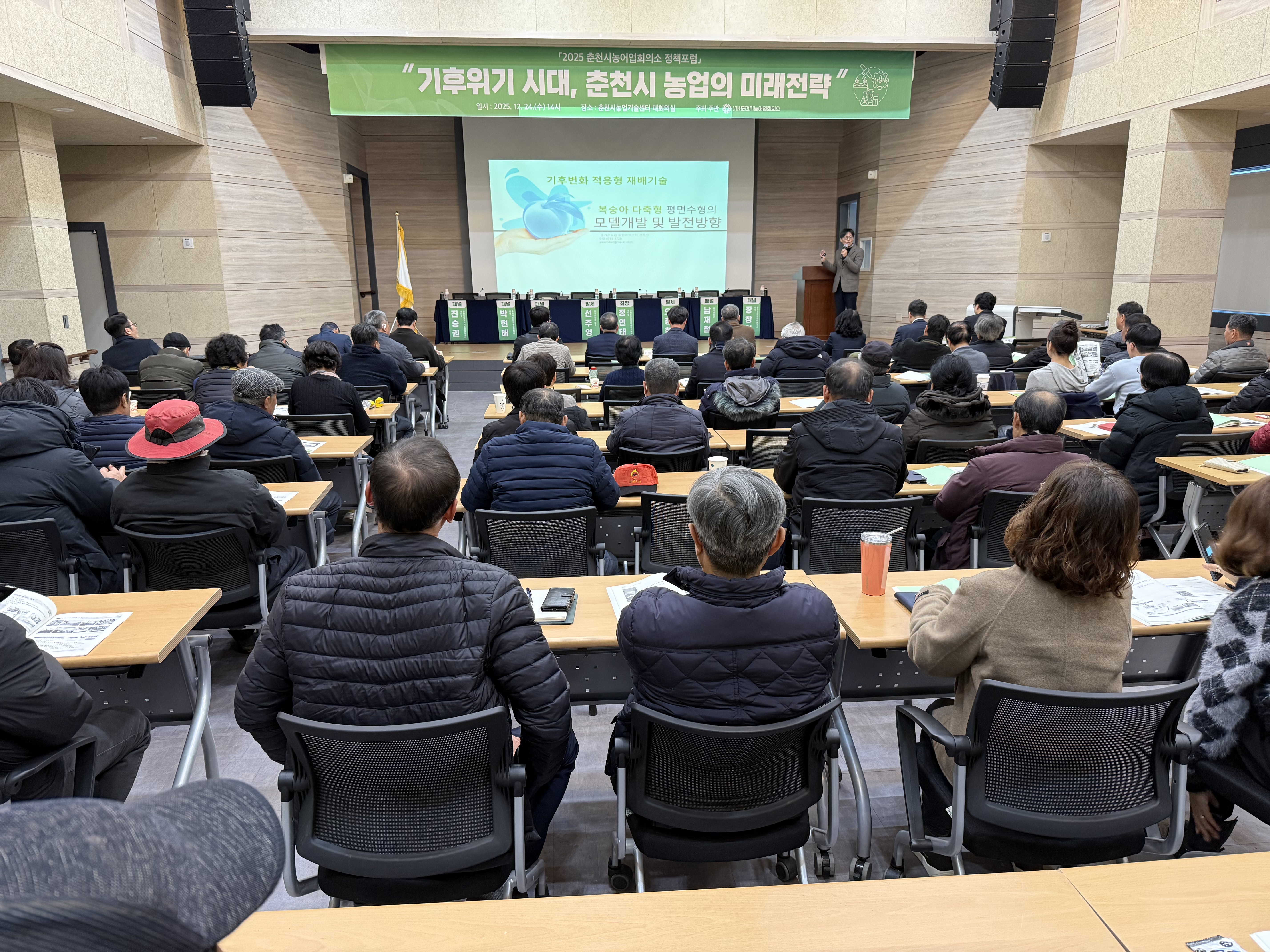 12월 24일, 춘천시농업기술센터에서 ‘2025춘천시농어업회의소 정책포럼’이 열렸습니다. 농업인을 비롯한 농업인 단체, 유관기관 80여명이 참석한 이날 포럼의 주제는 ‘기후위기 시대, 춘천시 농업의 미래전략’으로 기후변화로 인한 농업재해 증가과 농업 생산성 저하에 대응하기 위해 대응전략을 모색하고자 마련되었습니다. |